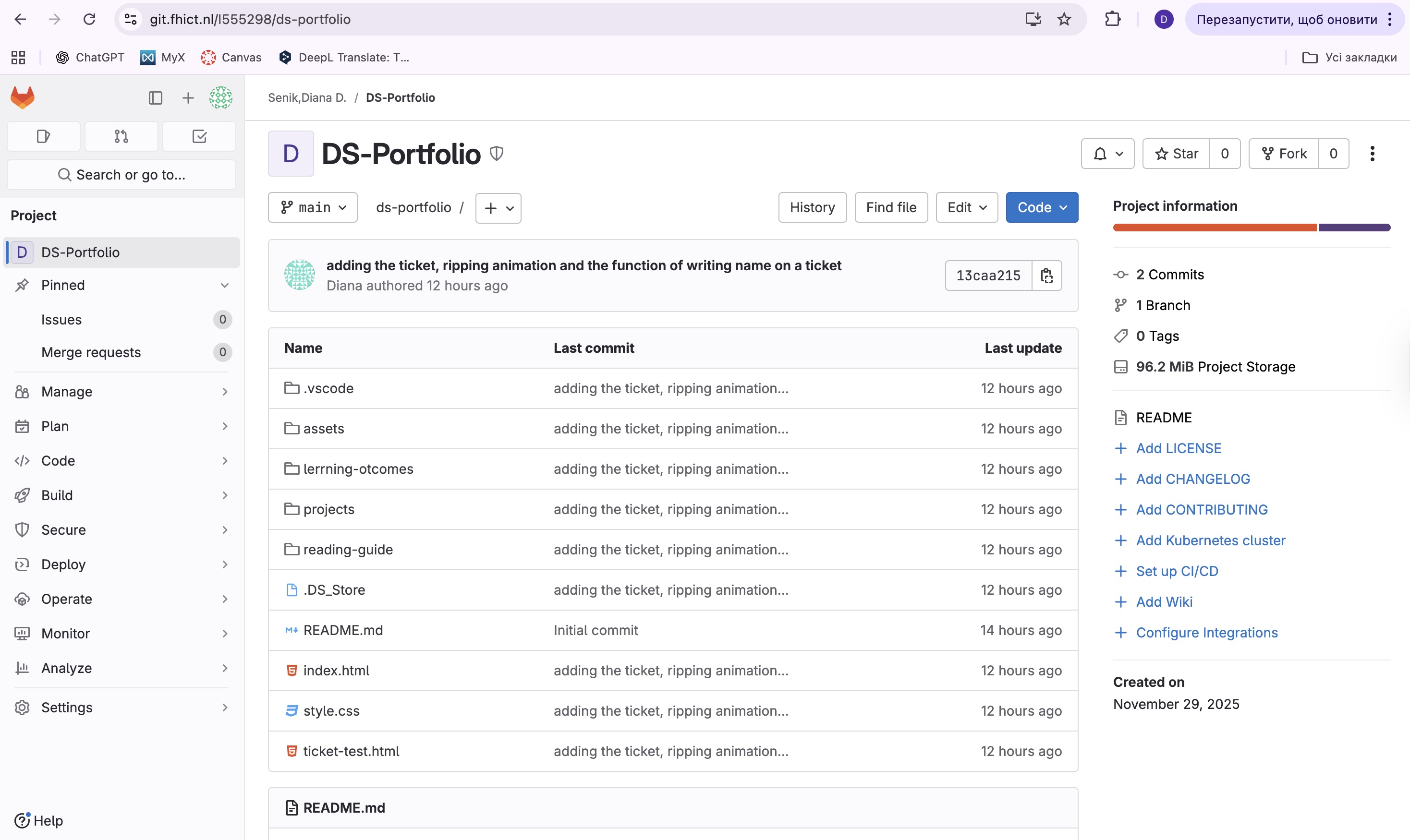 I created a GitLab repository to manage the development of my portfolio website. Every time I made updates, I committed and pushed the changes . Using Git allowed me to track my progress and keep my workflow organized throughout the process.
