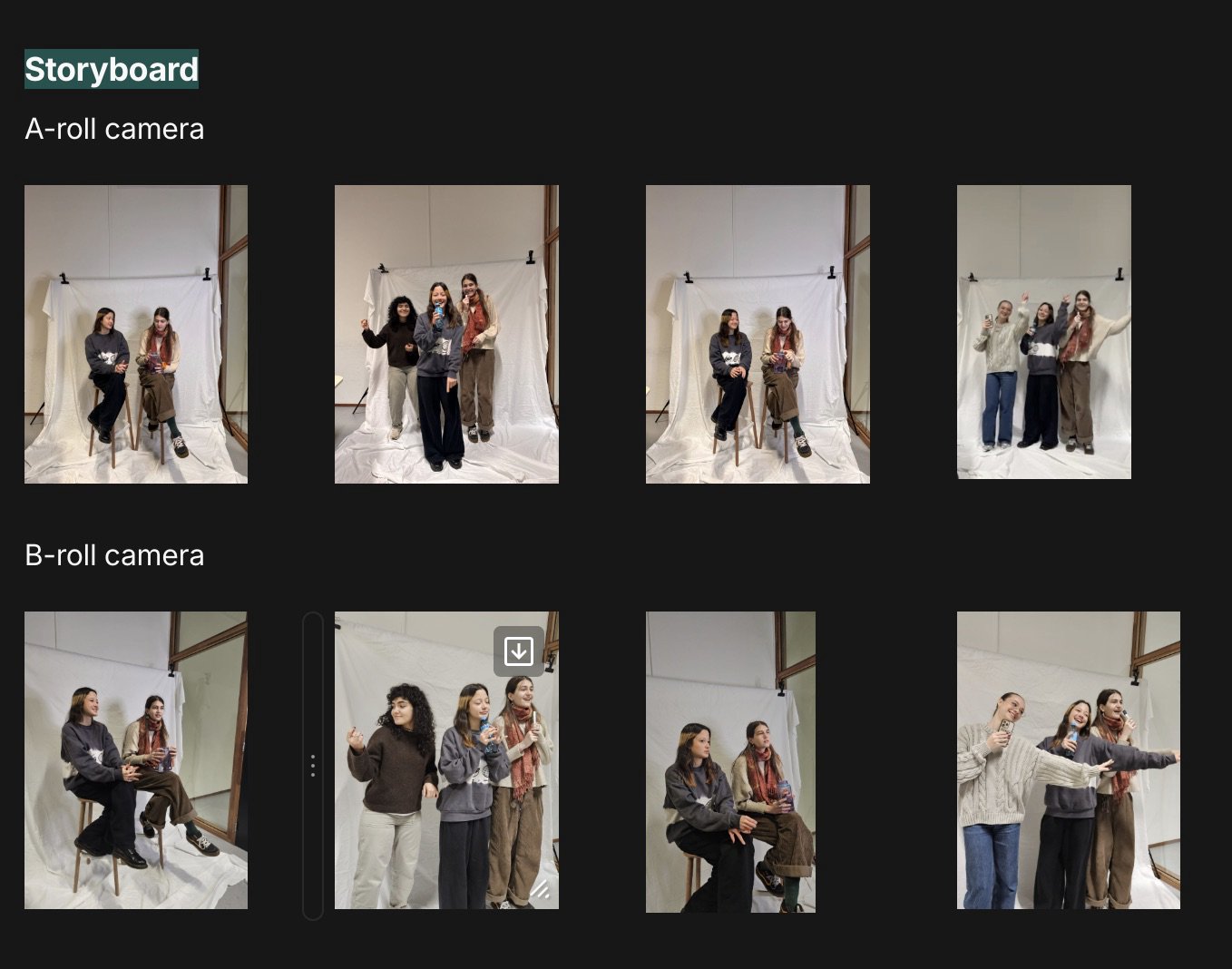 This preparation helped us stay organized during filming. Merging the shot list with the storyboard made the plan easier to follow and ensured we didn’t miss important shots . It also helped us communicate our vision more effectively within the group.