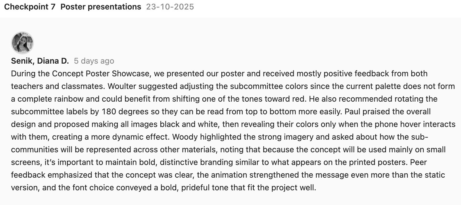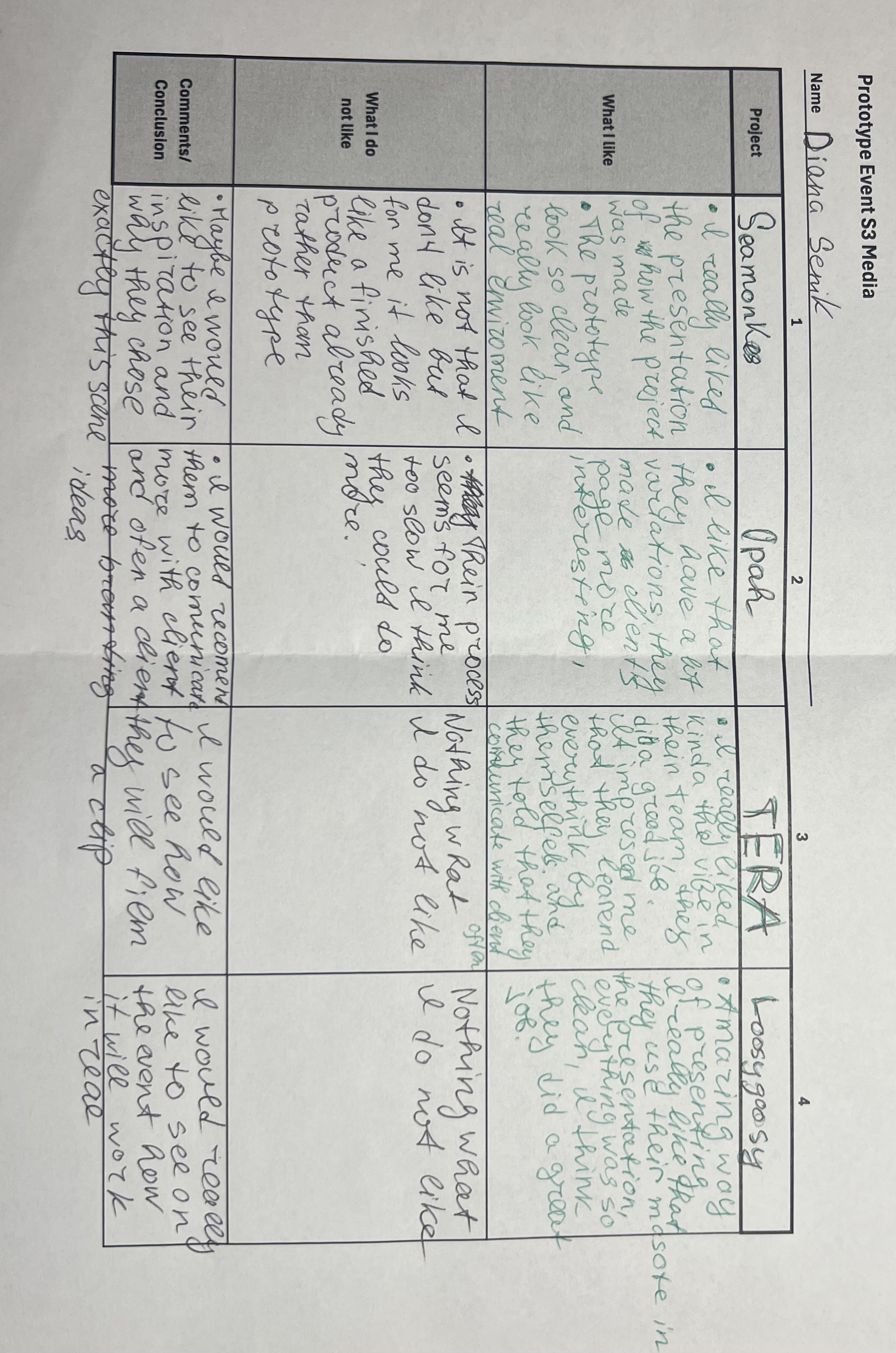 I learned how to present design decisions clearly and support them with prototypes and visual materials . Observing other teams helped me understand how to give structured, constructive feedback. Writing down the feedback I shared made me more aware of my role in the design process .